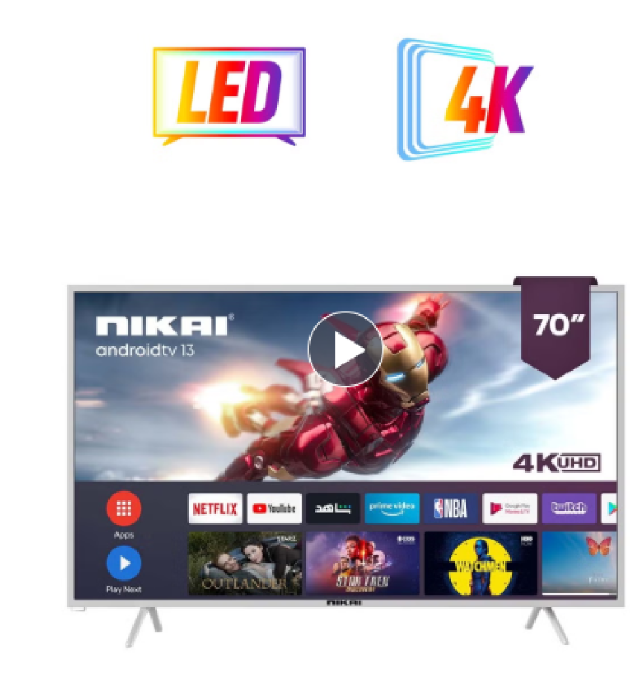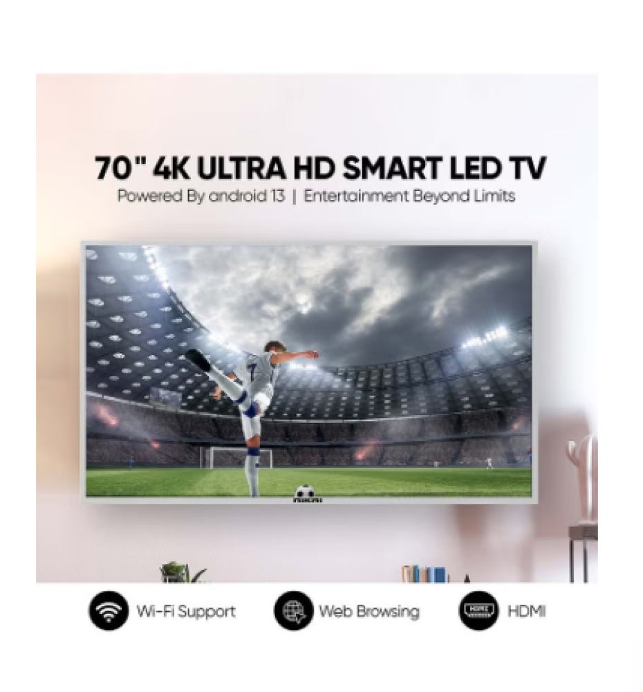 تميز تلفزيون نيكاي الذكي LED QLED مقاس 70 بوصة بإطار معدني أسود أنيق وحامل، ويوفر دقة مذهلة تبلغ 3840 × 2160 (4K).