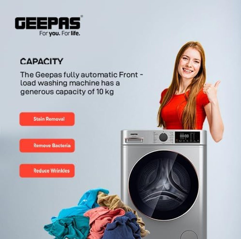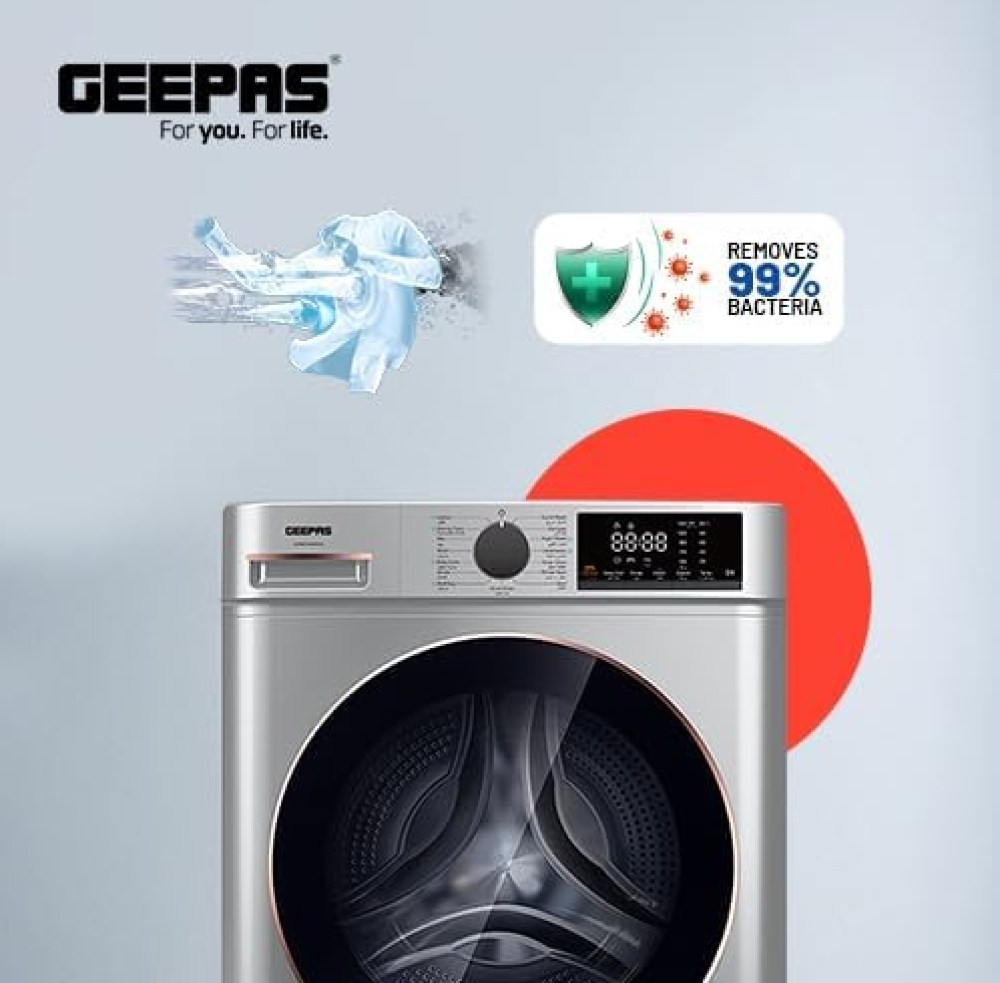 غسالة تحميل أمامي من جيباس، غسالة متطورة وفعالة ومتينة وعالية الأداء مع شاشة رقمية بسعة 10 كجم ومحرك تيار مباشر عديم المسفرات وتنظيف بالبخار، لون رمادي معدني، رقم القطعة GWMF1041SRG