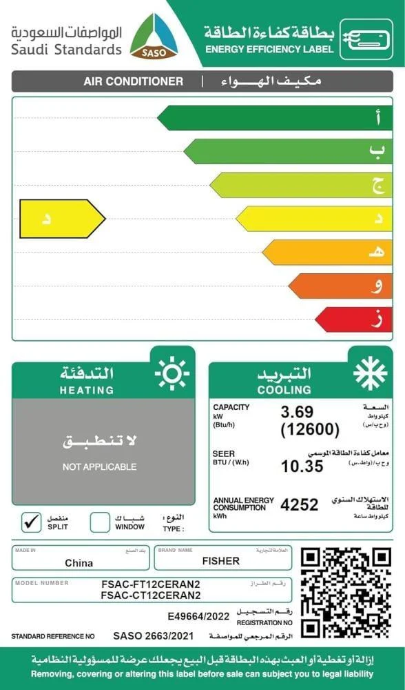 FSACQD-XF12CIB – فيشر مكيف هواء سبليت انفيرتر- 12000 وحدة حرارية بريطانية – بارد فقط- واي فاي